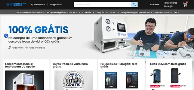 Um e-commerce que reúne todos os produtos oferecidos pela Insinis para que o técnico possa investir com facilidade na sua própria casa em um equipamento que aumente seus lucros. Nossa métrica de sucesso é baseada no número de inscrições e compras no site.